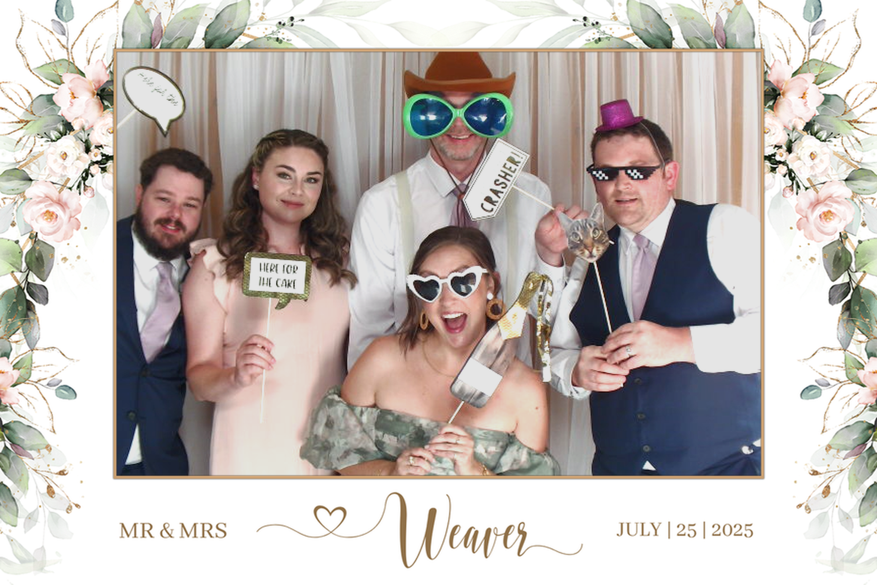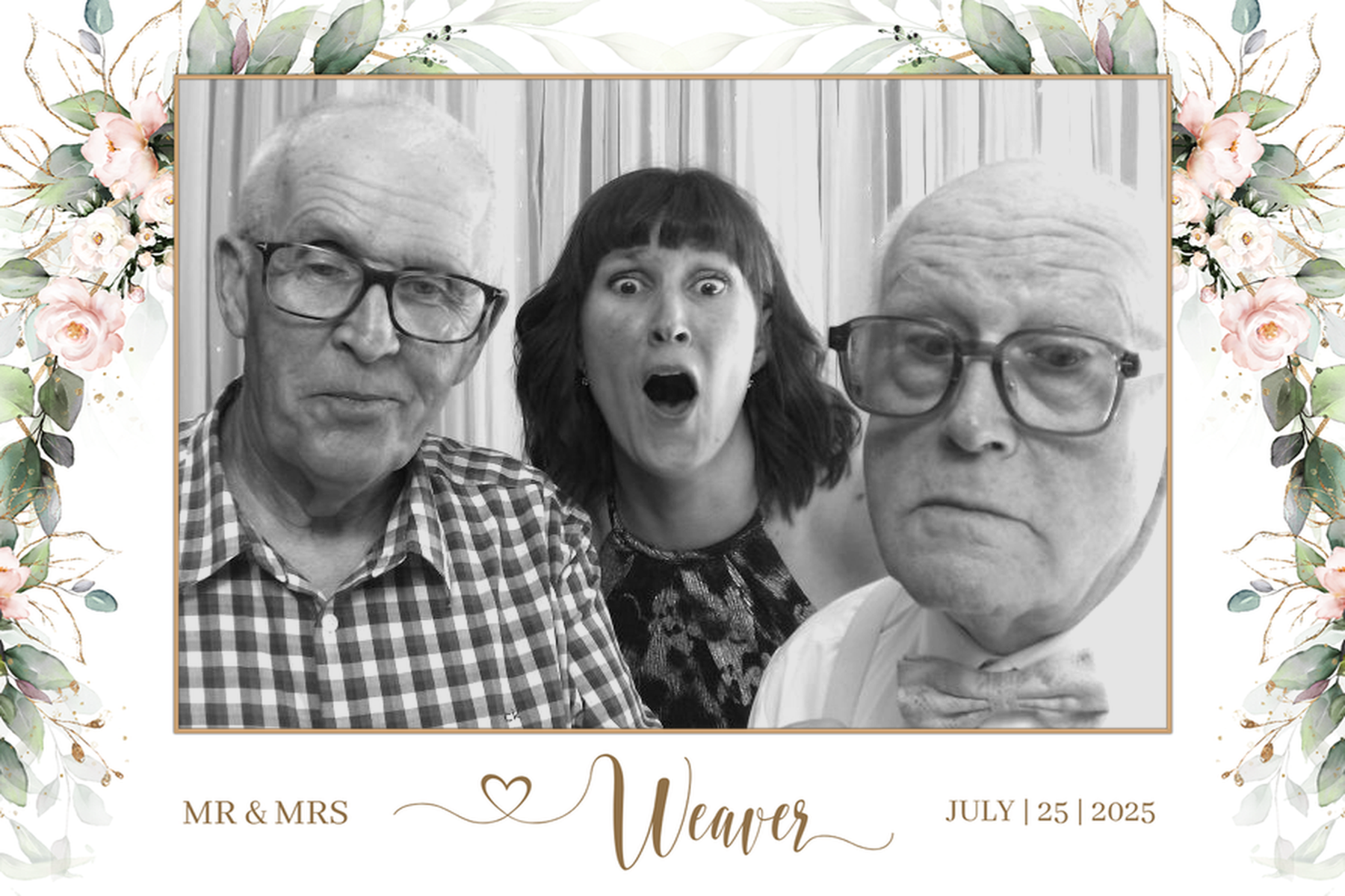 Add a personalized touch to your photo booth experience with our customizable templates, which are included in all our packages! Choose from various designs in either 4x6 or 2x6 ratios, featuring single or multi-photo modes. Each template will be tailored with your name and the date of your event, ensuring it reflects your unique style and captures every memorable moment. View available templates here.